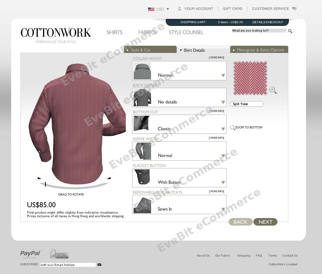 该项目基于 Magento 开发,并创新性地整合了当时先进的 3D Flash Engine,实现在线衬衫定制的可视化体验。用户可自由选择面料、版型、领型、袖口等个性化配置,并通过3D界面实时预览成衣效果,大幅提升用户参与感与转化率。这种“3D可视化 + 电商系统”的深度融合,在当时电商行业中具有极强的创新性。